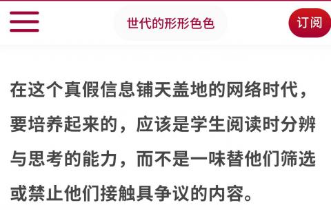 在这个真假信息铺天盖地的网络时代,要培养起来的,应该是学生阅读时分辨与思考的能力,而不是一味替他们筛选或禁止他们接触具争议的内容。