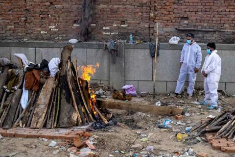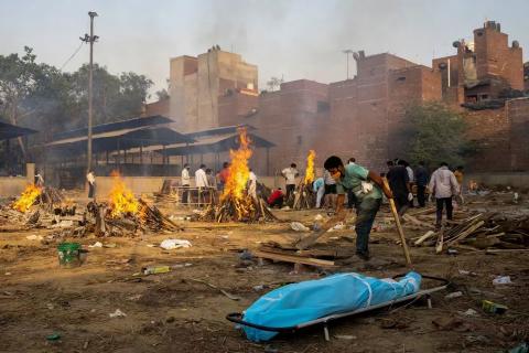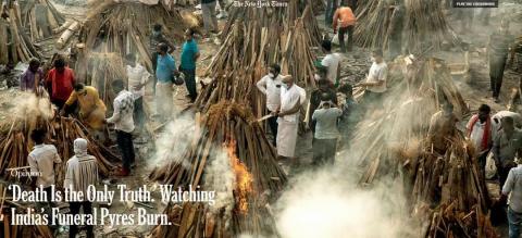 图为印度疫情高峰时被媒体嘲笑的景象——印度是个宗教国家,"露天焚化"是印度教的传统方法,要死者儿子才有权点火的——殡仪馆忙不过来时,不用插队费的"自助"方法。
