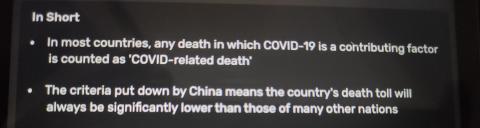 在大多数国家,任何新冠为起作用因数的死亡算作"新冠相关死亡"——中专生举个例:假如有高血压病的,得冠后发烧难受血压升高中风死亡,在大多数国家算新冠死亡,在某个少数不算新冠死亡。
