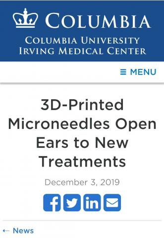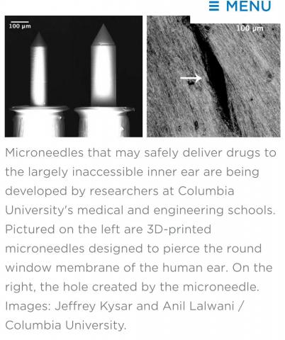 哥伦比亚大学医学院搞出用于内耳注药的微针,针尖不到人头发的1%--估计若干年后,这针扎身上肉不会疼,心会疼。